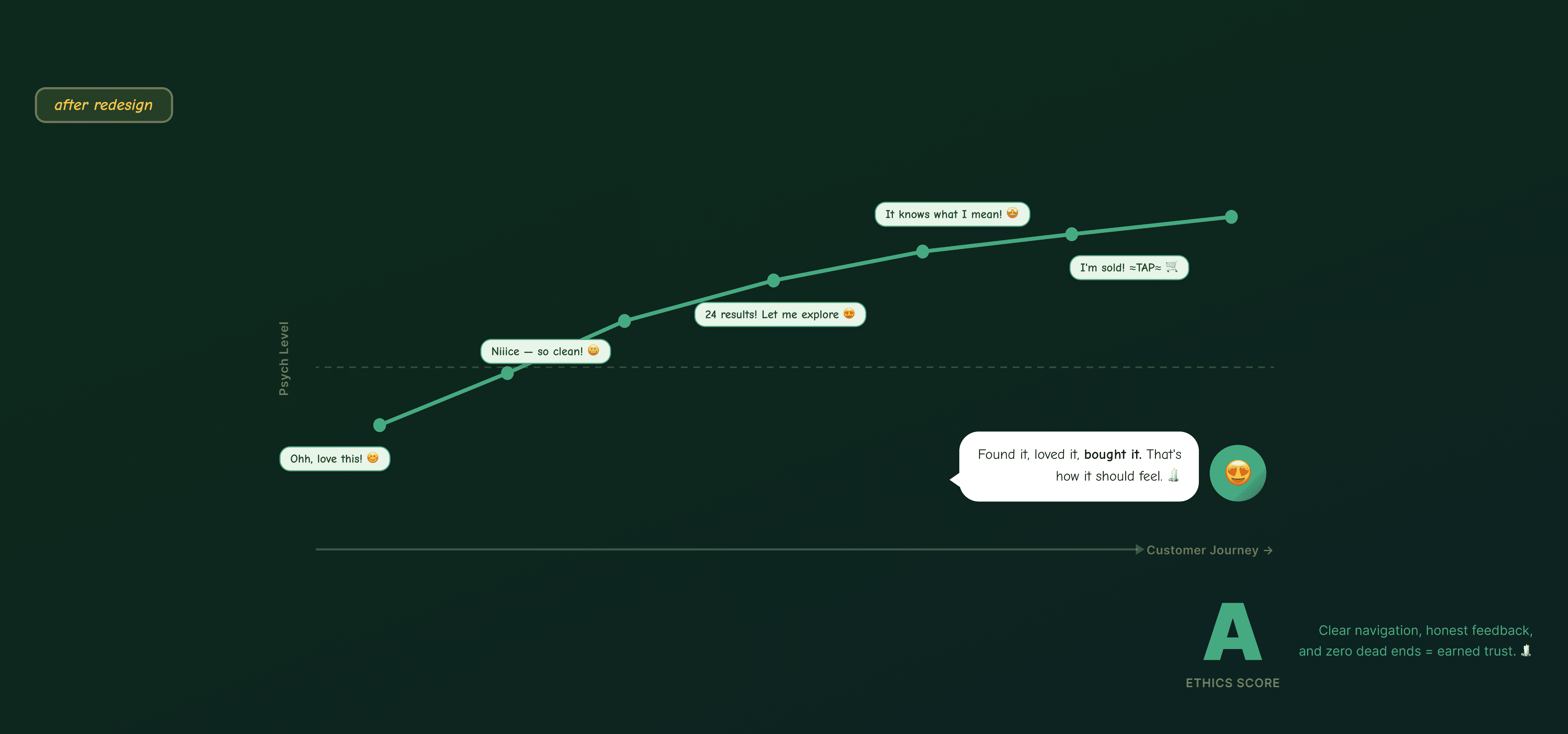 understand what you're looking for, and we want to help you find it." The ethical version surfaces genuinely relevant results — not just high-margin products — and corrects mistakes without making users feel dumb for trying.