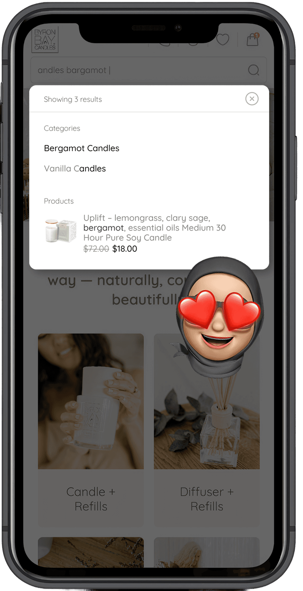 Ohhh — it knows what I meant! Products, categories, and it even corrects the typo. No dead ends.