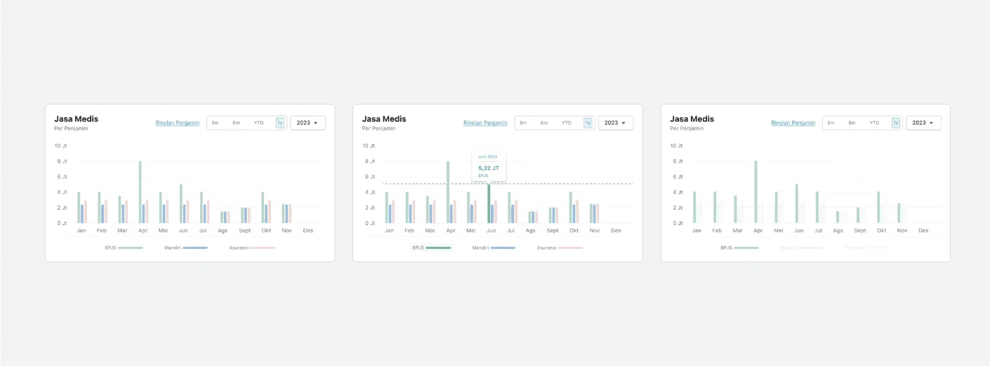 The number one question in every interview: "Am I actually getting what I was promised?" Built a donut chart that shows expected vs. actual, with a hover state that surfaces each variable, tax, BPJS, fees, allowances, without turning the screen into a spreadsheet.